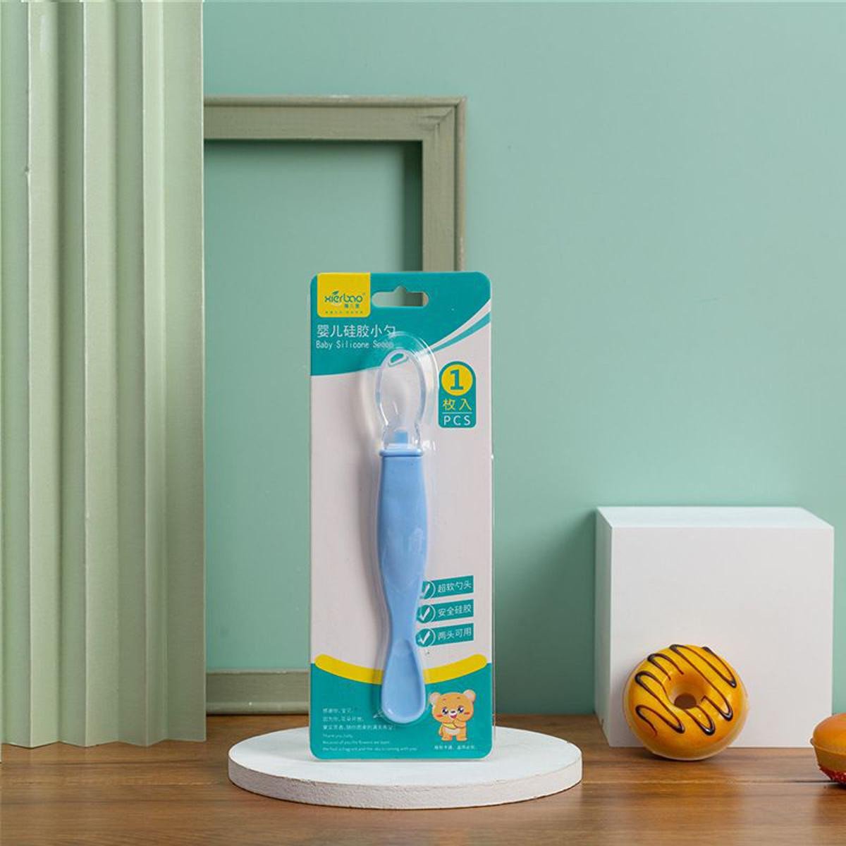 - Dual-ended spoon with a soft silicone end and a rigid end depending on the type of the meal being fed