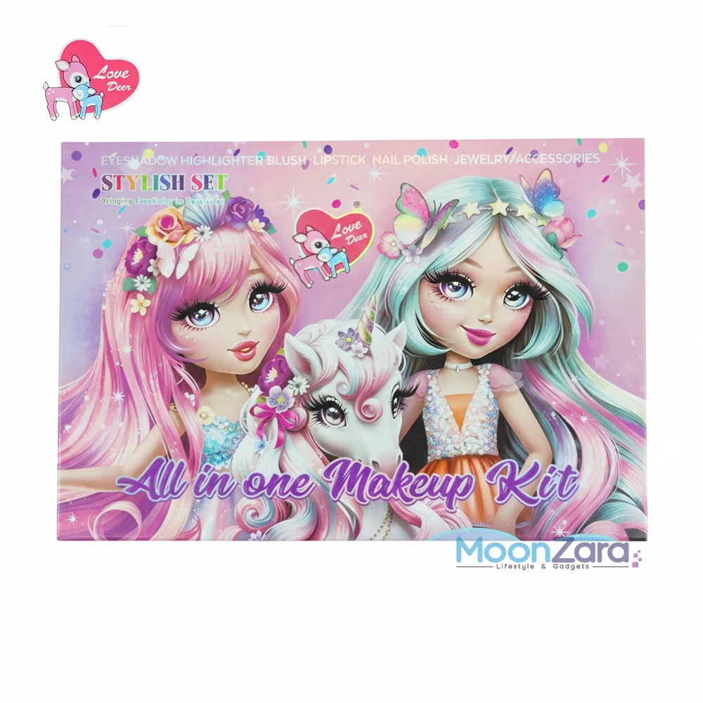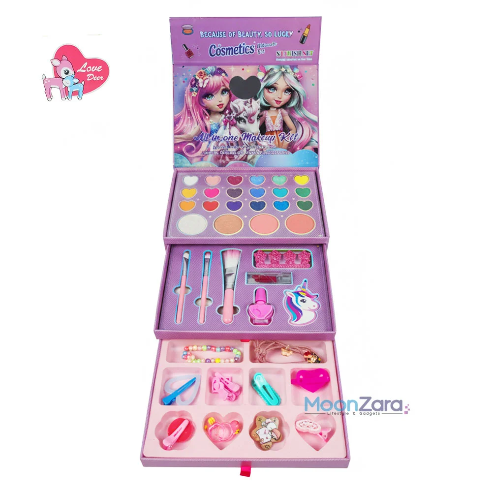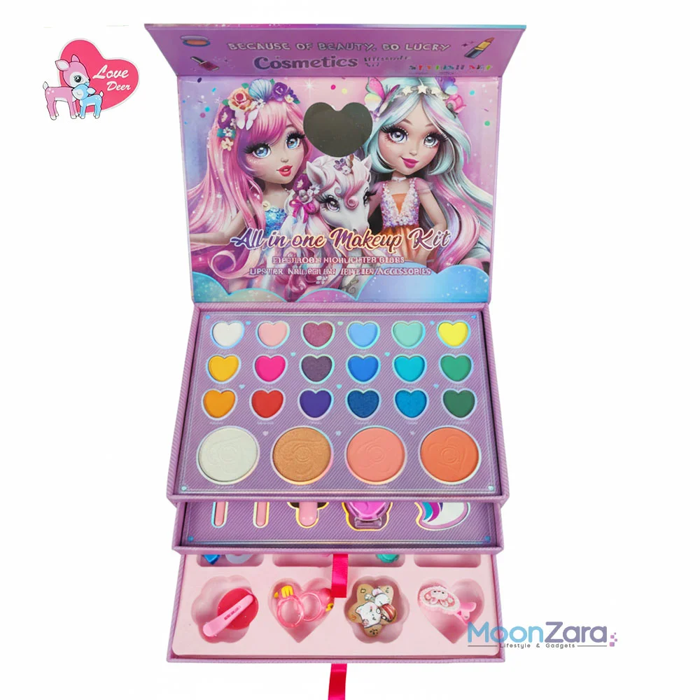 Bring endless glamour, creativity, and fun to your little princess with the Unicorn 3-in-1 Princess Beauty Kit – 42-Item Makeup & Jewelry Accessories Set. This ultimate kit combines safe, colorful makeup with stylish jewelry and unicorn-themed fun, making it the perfect gift for birthdays, Eid, or any special occasion.